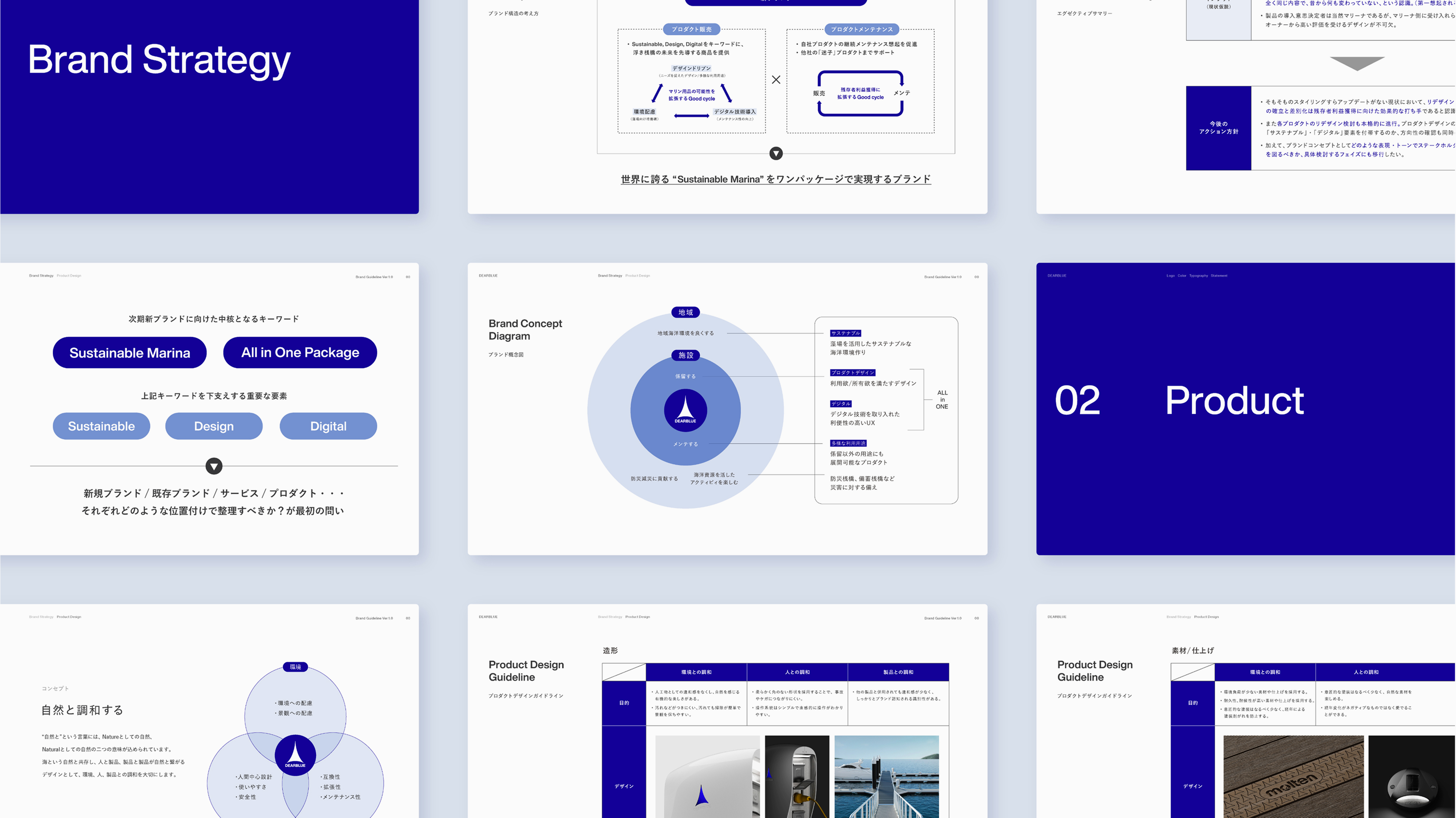 在制定 DEARBLUE 的品牌战略时,首先作为外部环境调研,我们走访了国内主要游艇码头,对运营者及使用者进行了访谈和实地考察。结合游艇码头产品的实际使用情况,深入挖掘了码头运营中的实际业务课题、市场趋势以及用户对设计的深层需求。同时,在内部环境梳理方面,通过对该公司现有海洋产品线的产品组合分析,以及对包括管理层在内的利益相关者的访谈,统一了团队对新品牌开发方向的认识。