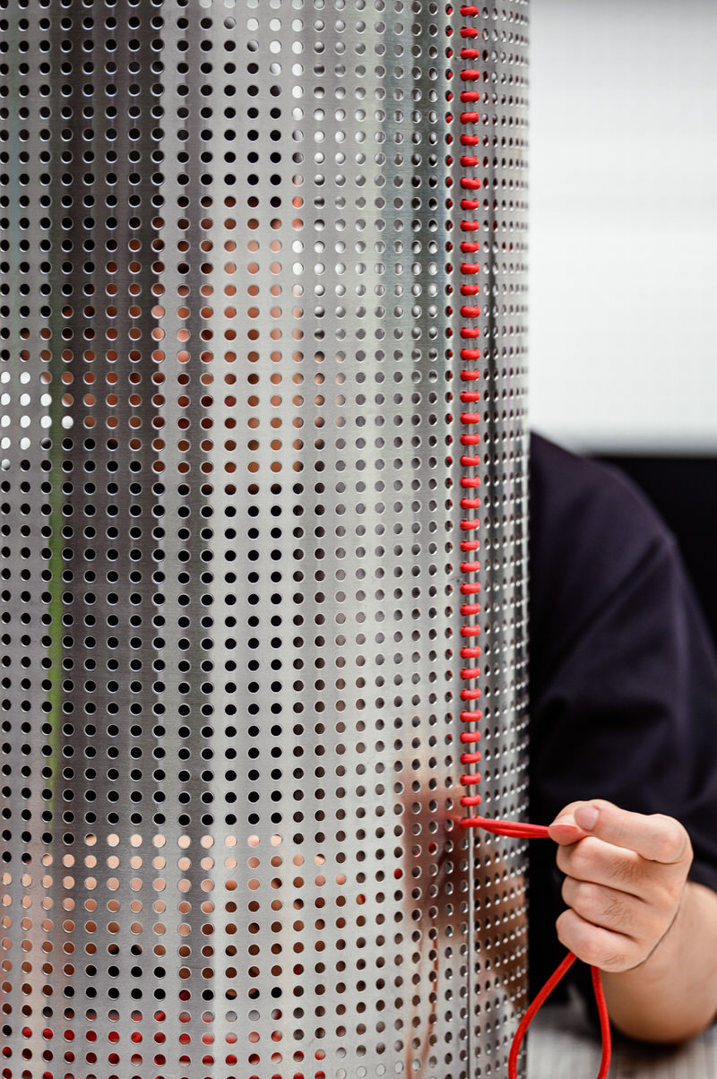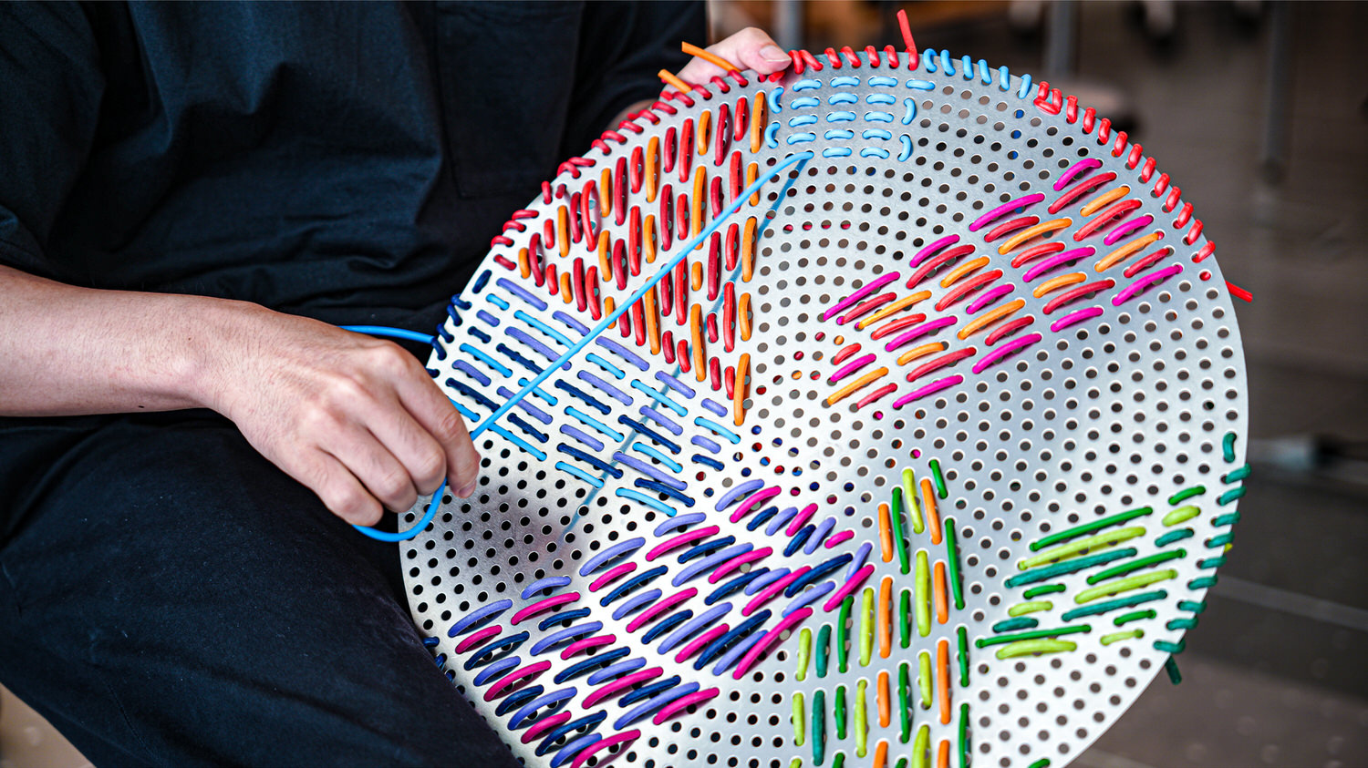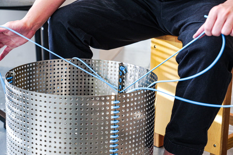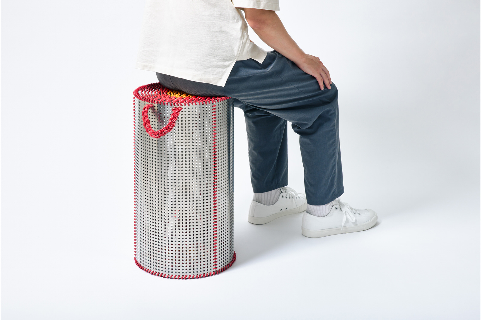 「X-TPU」不仅具有极高的机械物理性能(如耐久性),其自由着色的高装饰性也是其特点之一。我们通过色彩鲜艳的绳索编织,制作出多彩的原型产品来表现这一魅力。我们除了制作产品的原型设计之外也设计了整体品牌的主视觉 表面整体采用「X-TPU」编织而成,打造出兼具缤纷色彩与舒适坐感的座面。 通过将「X-TPU」成束编织,在增加设计感的同时,打造出了易于携带且耐磨性强的提手。 Stitch 仅由 「X-TPU」 与冲孔金属板这两种材料通过编织构成。由于没有使用胶水或螺丝等连接方式,因此在产品完成其使用使命后,也能够将材料分别拆解,便于回收再利用。 Research 设计的切入点,是思考什么样的产品原型最能直观传达这种材料如绳索般、同时兼具高弹性与高强度的特性。 We approached the design by first considering what would be the optimal prototype to intuitively convey the material characteristics of high stretchability and strength in a cord-like form. 通过设计一种“物体的组装方式本身就直接决定其功能”的原型,旨在更直接地传达 X-TPU 的特性,因此各个部件之间的连接结构全部仅通过缝制完成。
