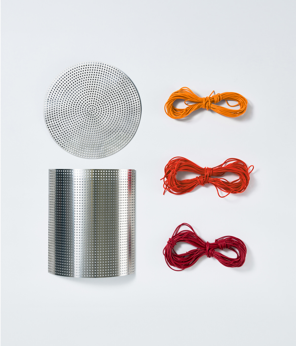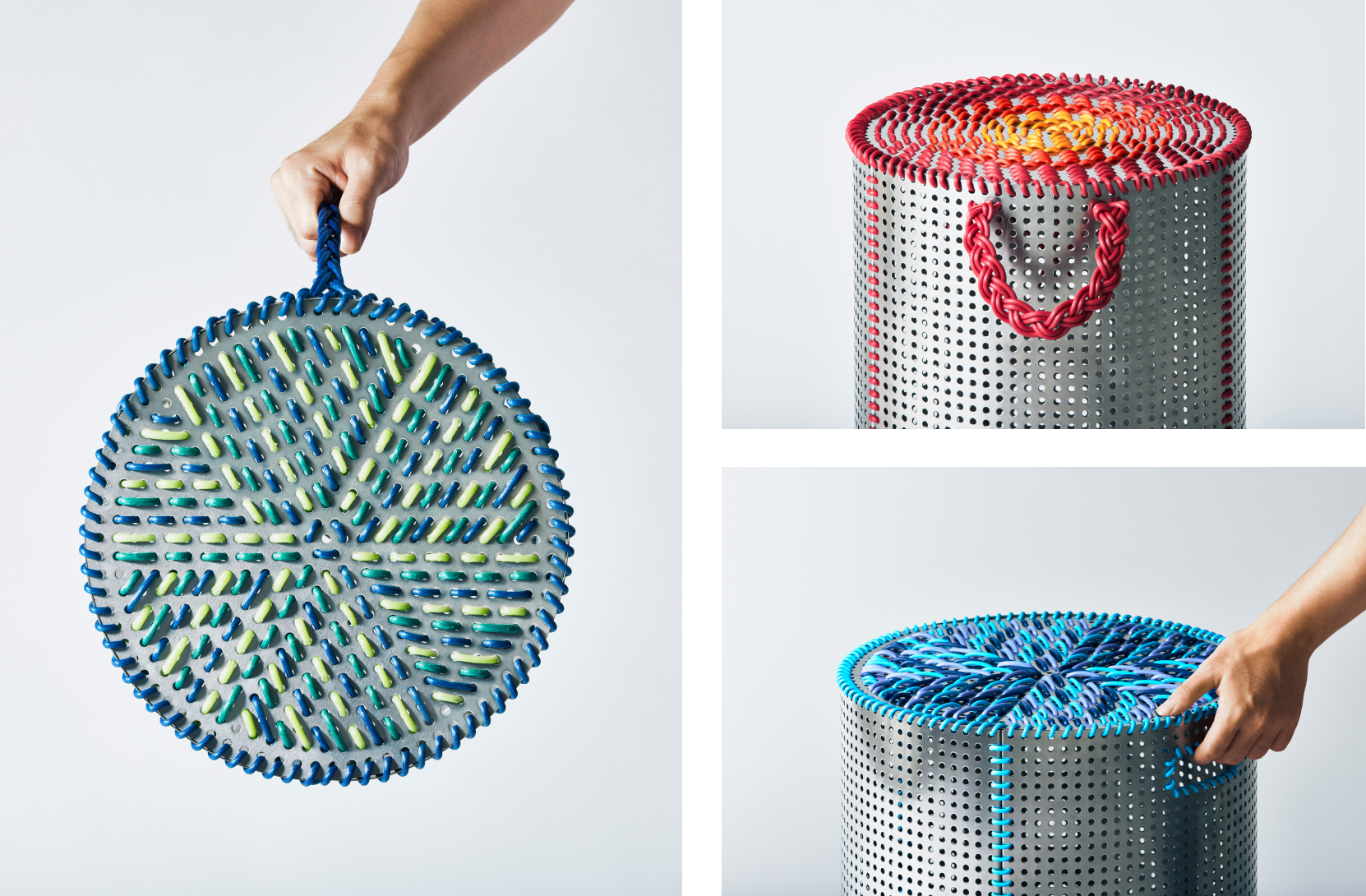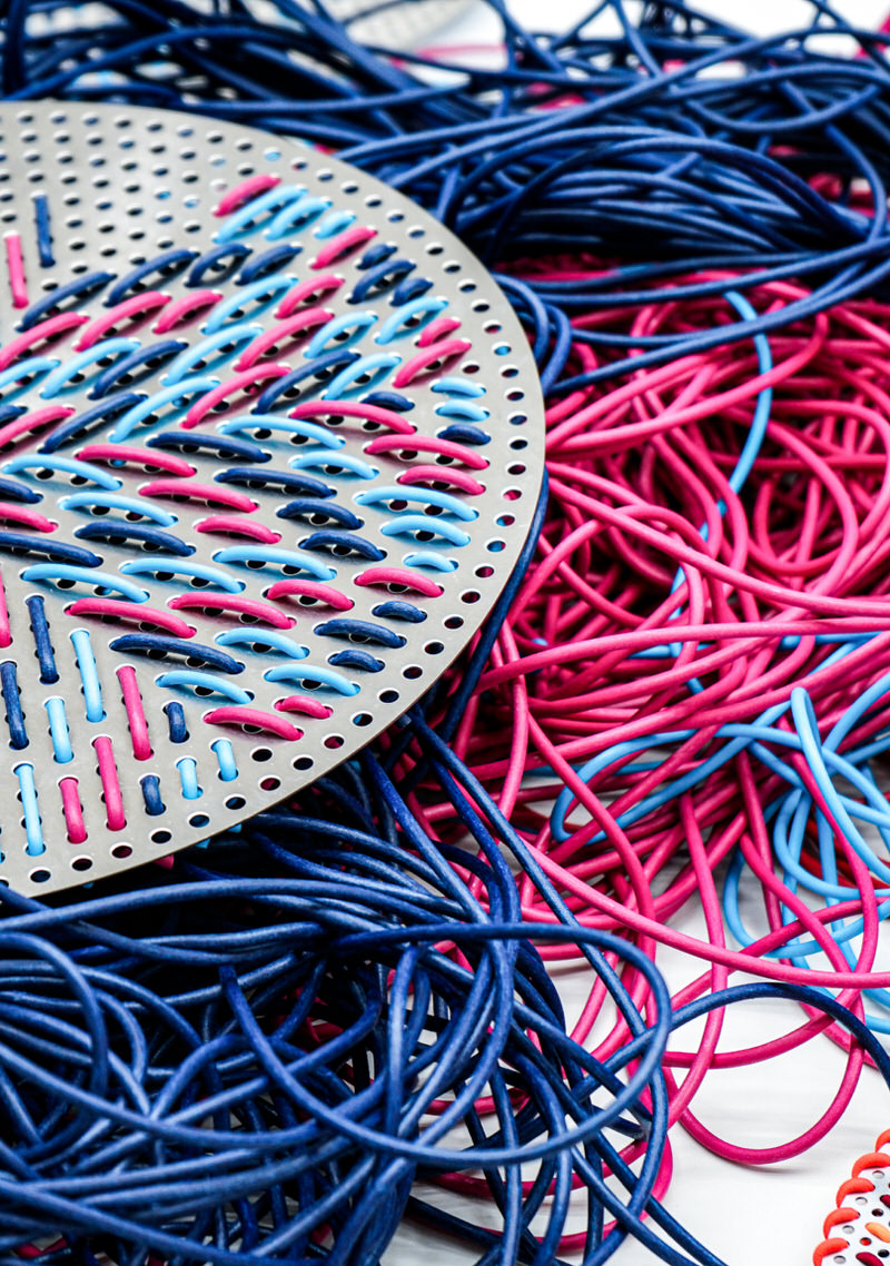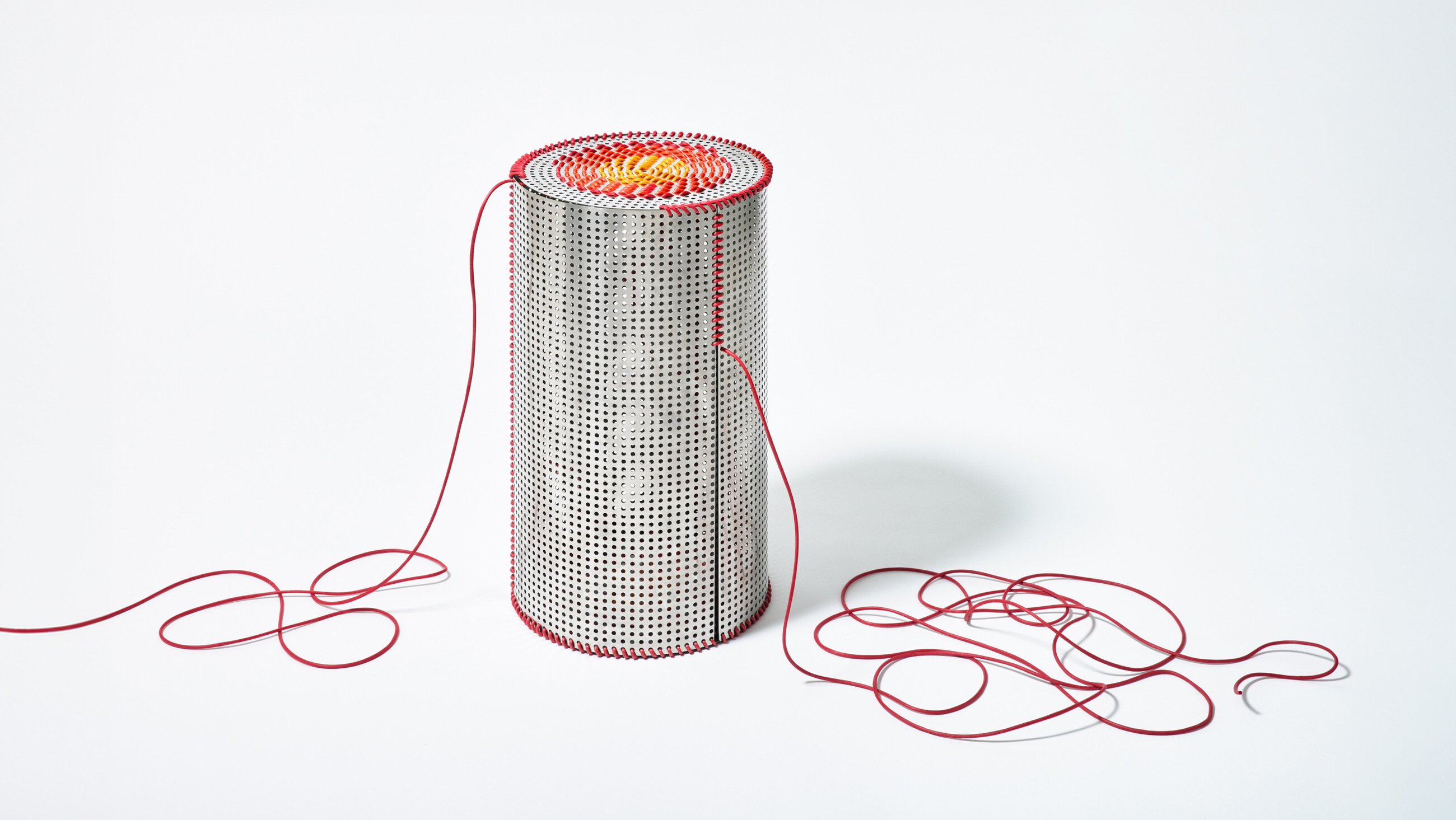 「X-TPU」不仅具有极高的机械物理性能(如耐久性),其自由着色的高装饰性也是其特点之一。我们通过色彩鲜艳的绳索编织,制作出多彩的原型产品来表现这一魅力。我们除了制作产品的原型设计之外也设计了整体品牌的主视觉 表面整体采用「X-TPU」编织而成,打造出兼具缤纷色彩与舒适坐感的座面。 通过将「X-TPU」成束编织,在增加设计感的同时,打造出了易于携带且耐磨性强的提手。 Stitch 仅由 「X-TPU」 与冲孔金属板这两种材料通过编织构成。由于没有使用胶水或螺丝等连接方式,因此在产品完成其使用使命后,也能够将材料分别拆解,便于回收再利用。 Research 设计的切入点,是思考什么样的产品原型最能直观传达这种材料如绳索般、同时兼具高弹性与高强度的特性。 We approached the design by first considering what would be the optimal prototype to intuitively convey the material characteristics of high stretchability and strength in a cord-like form. 通过设计一种“物体的组装方式本身就直接决定其功能”的原型,旨在更直接地传达 X-TPU 的特性,因此各个部件之间的连接结构全部仅通过缝制完成。