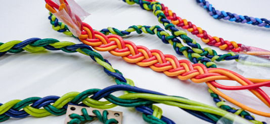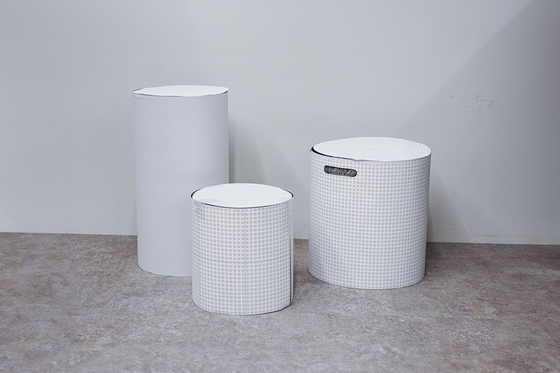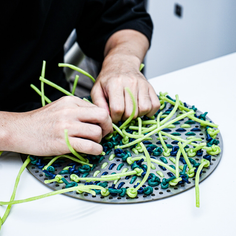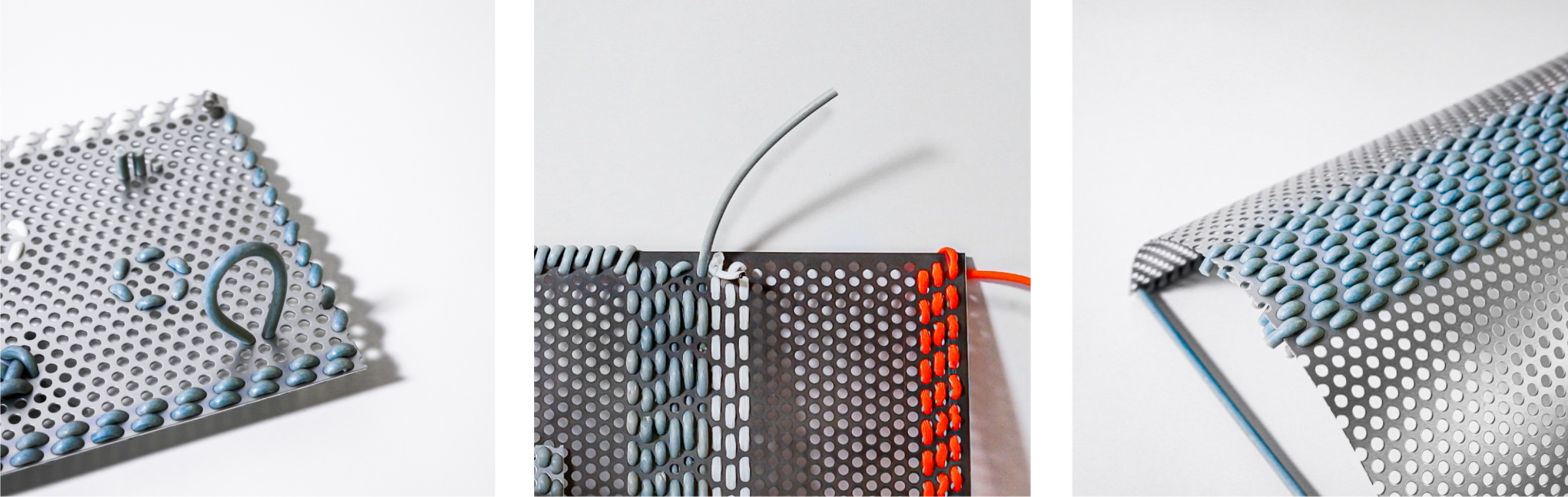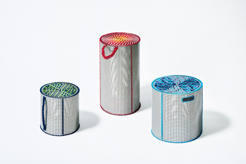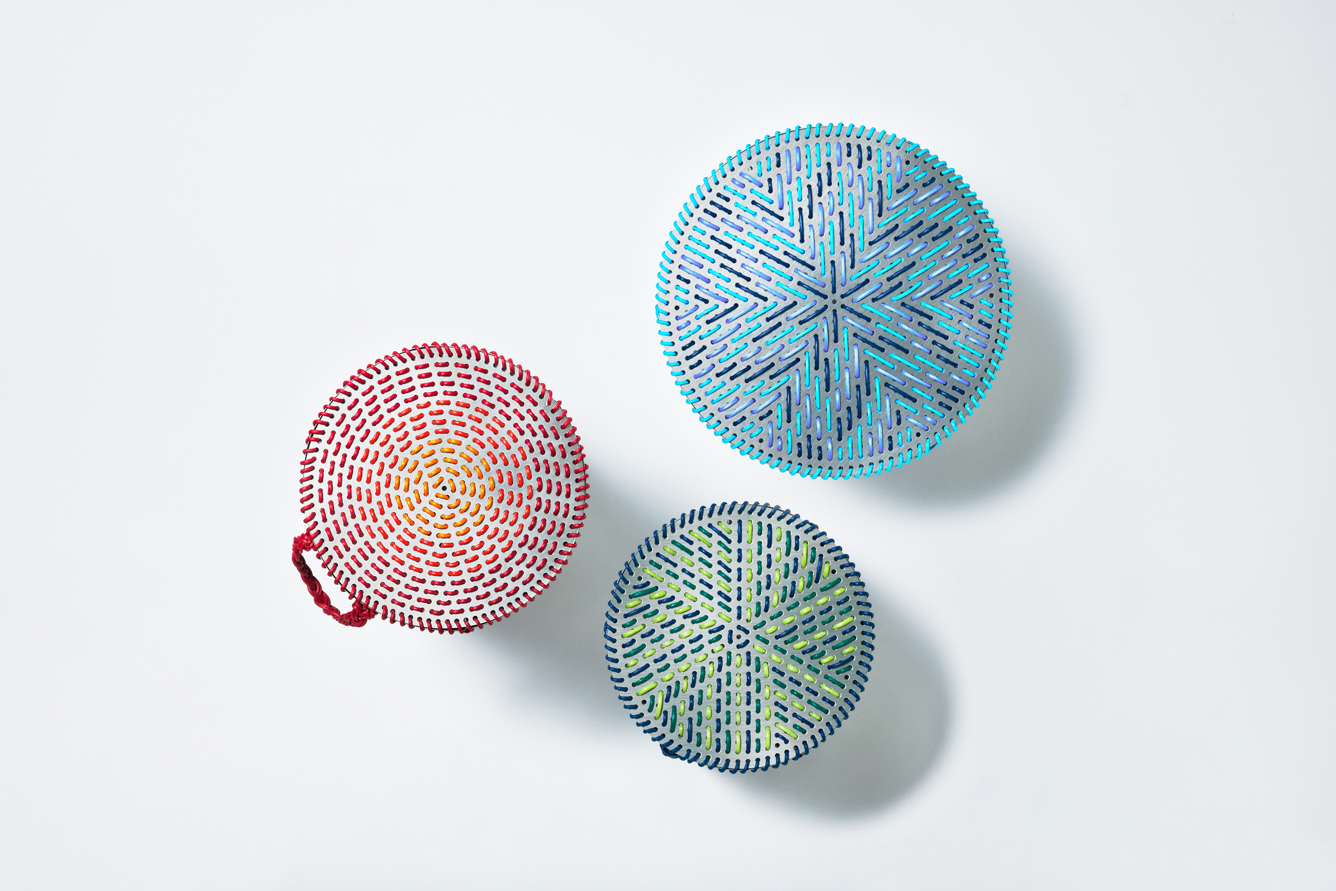 「X-TPU」不仅具有极高的机械物理性能(如耐久性),其自由着色的高装饰性也是其特点之一。我们通过色彩鲜艳的绳索编织,制作出多彩的原型产品来表现这一魅力。我们除了制作产品的原型设计之外也设计了整体品牌的主视觉 表面整体采用「X-TPU」编织而成,打造出兼具缤纷色彩与舒适坐感的座面。 通过将「X-TPU」成束编织,在增加设计感的同时,打造出了易于携带且耐磨性强的提手。 Stitch 仅由 「X-TPU」 与冲孔金属板这两种材料通过编织构成。由于没有使用胶水或螺丝等连接方式,因此在产品完成其使用使命后,也能够将材料分别拆解,便于回收再利用。 Research 设计的切入点,是思考什么样的产品原型最能直观传达这种材料如绳索般、同时兼具高弹性与高强度的特性。 We approached the design by first considering what would be the optimal prototype to intuitively convey the material characteristics of high stretchability and strength in a cord-like form. 通过设计一种“物体的组装方式本身就直接决定其功能”的原型,旨在更直接地传达 X-TPU 的特性,因此各个部件之间的连接结构全部仅通过缝制完成。